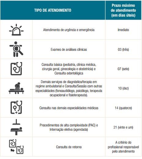 O material explica, por exemplo, que consultas com especialistas como pediatra e ginecologista devem ser agendadas para, no máximo, uma semana depois da solicitação. Urgências e emergências devem ser atendidas imediatamente, e os exames de análises clínicas, em até três dias. Já os procedimentos de alta complexidade e internação eletiva têm até 21 dias para serem atendidos.