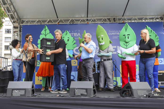 A professora de Ensino Médio Daiana Aparecida Stresser, do bairro Abranches, foi uma das homenageadas. “Lá em casa todos participam, eu e meus dois filhos, desde 2024. É bom para o meio ambiente e também tem uma função terapêutica para minha filha, que tem autismo”, contou a educadora, que fez questão de tirar fotos com integrantes da Família Folhas. Panmela Cristina Machado Habitzreuter também compareceu ao Domingo no Centro para receber a homenagem.