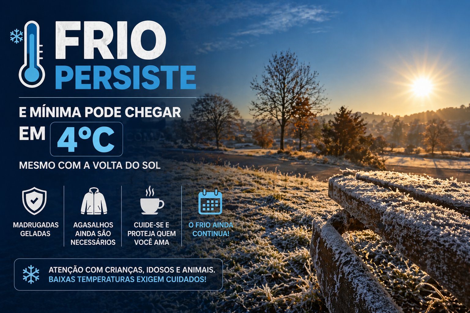 Mesmo com a melhora, o frio ainda exige atenção. Há previsão de que áreas do Paraná possam registrar mínimas próximas de 4°C nos próximos dias, especialmente em regiões mais ao sul e em áreas de maior altitude.