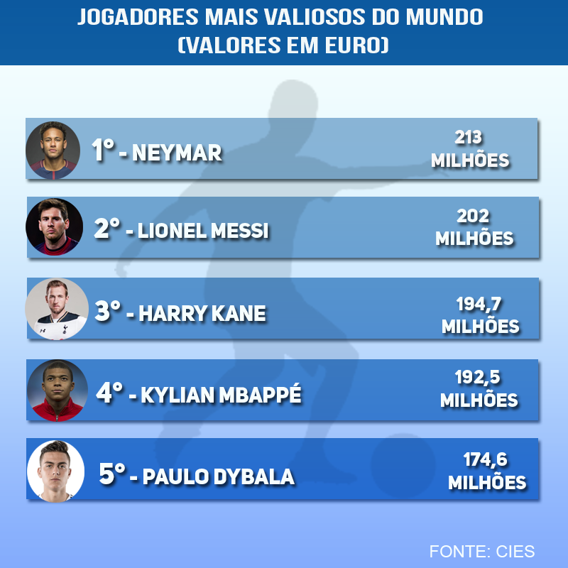 Personagem da transação mais cara da história do futebol, o brasileiro Neymar é atualmente o jogador mais valioso do mundo. Segundo o Observatório de Futebol do CIES, centro de estudos com sede na Suíça, o atacante do PSG tem valor de mercado estimado em 213 milhões de euros, algo em torno de 825 milhões de reais. Na segunda posição aparece o argentino Lionel Messi (202 milhões de euros), seguido pelo inglês Harry Kane (194,7 milhões de euros), jogador que mais marcou gols em 2017.
