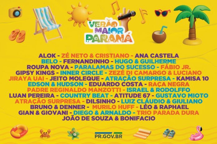 O Governo do Paraná anunciou nesta terça-feira (21) os nomes das atrações do Verão Maior Paraná 2026. São cinco finais de semana seguidos de espetáculos gratuitos, de 9 de janeiro a 8 de fevereiro. Entre as novidades estão shows nas quintas-feiras, atrações internacionais e palcos que devem ser maiores do que no ano passado. Os shows acontecerão nas praias de Matinhos e Pontal do Paraná e terão transmissão do SBT, Band, TVCI, Banda B e TV Paraná Turismo para todo o Brasil.